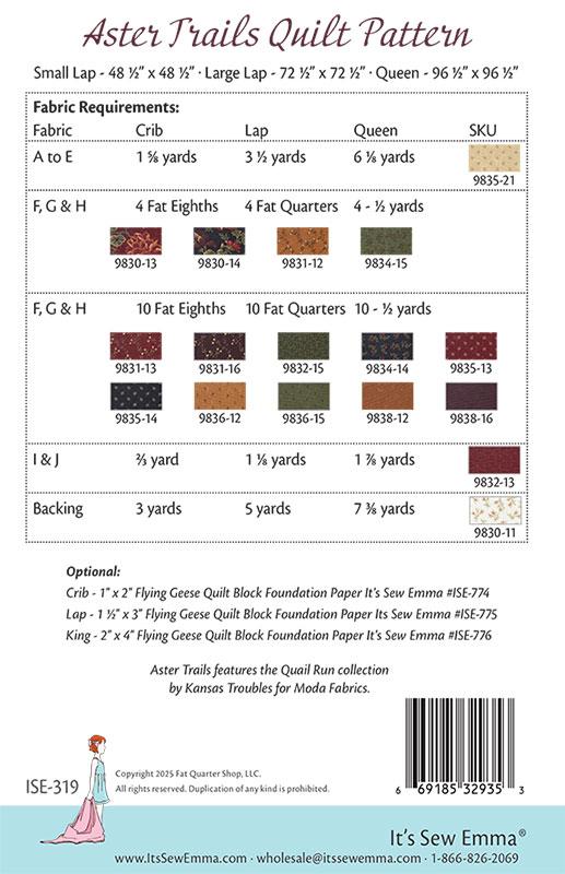 The Aster Trails Quilt Kit includes the Aster Trails Quilt Pattern by It's Sew Emma and Quail Run by Kansas Troubles Quilters fabrics for the quilt top and binding. Quilt finishes at approximately 72.5" x 72.5".